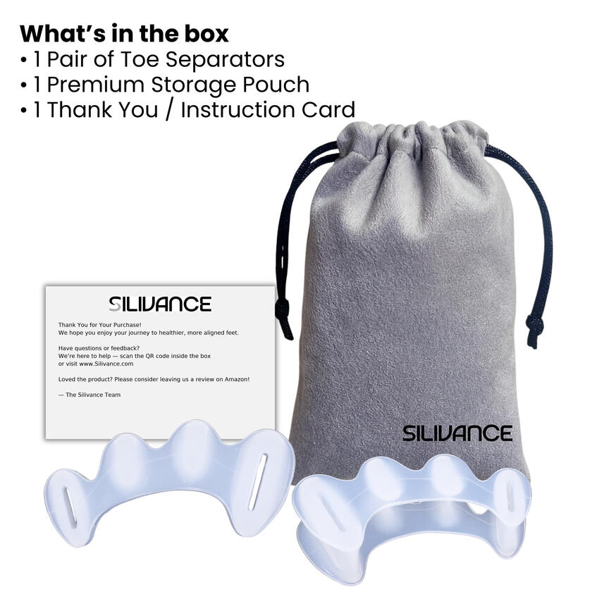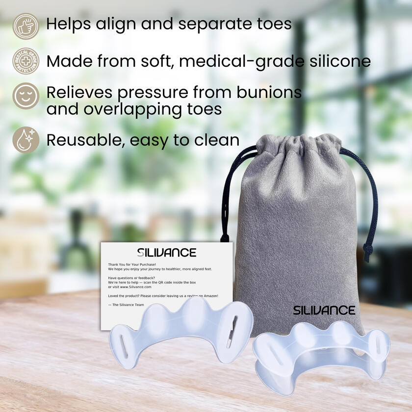 Silivance toe spacers gently align and separate your toes to relieve pressure from bunions, overlapping toes, and general foot fatigue.Made from soft, medical-grade silicone, they’re ideal for daily wear—barefoot, in socks, or even during light activity.Durable, washable, and comfortable, they promote better posture, alignment, and overall foot wellness.